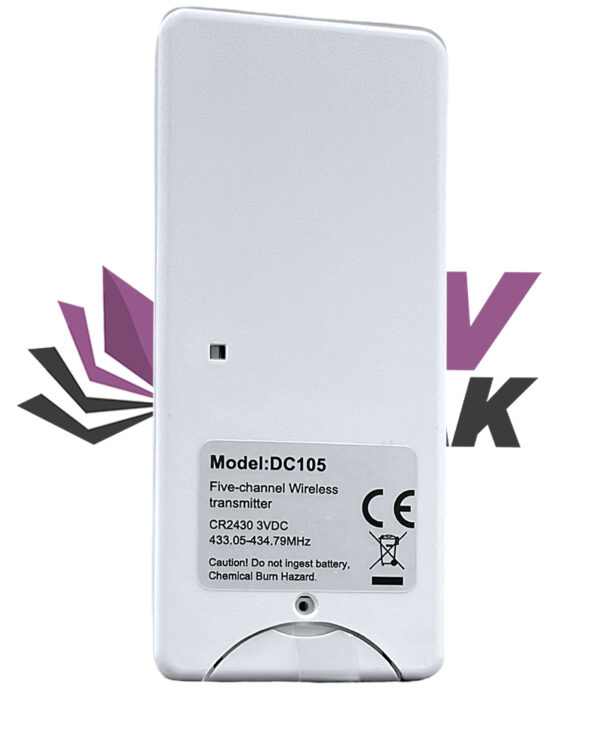 A DC 105 5 csatornás redőnymotor távvezérlő. A készülékhez tartozik egy fali tartó, amely segítségével könnyen elhelyezhető a falon. A távirányító kis méretű, így kényelmesen kezelhető. A LED fény jelzi, hogy a távirányító működik. A DC 105 5 redőny mozgatására alkalmas, de akár központi vezérlőként is használható, ha több redőnyt szeretnénk egyszerre mozgatni. A távirányító egy 3V-os CR2430 elemmel működik, amelyet a csomag tartalmaz. A távirányító 433,92 MHz-es frekvencián kommunikál a redőnymotorokkal, ezért elsősorban a SMART HOME R és RE típusú rádiós motorokkal kompatibilis. A távirányító egyszerűen és gyorsan telepíthető, a rögzítő furatok távolsága 15,2 mm.